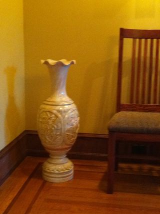 As I was returning to the car, Life partner noticed two tall urns standing in the sun. Whitish-yellow, delicately carved, standing on two pedestals. We drew in closely to look at them. I was thinking of the urn for our dining room. Although not pale green or porcelain, this looked much like the shape of the vase I had dreamed about recently. We were commenting to each other in amazement at how inexpensive the urns were, when a man about our age came out to tell us they were from Vietnam, made of marble, and were inexpensive probably because they might have been broken and repaired at some stage. After agreeing that we could buy just one, he worked laboriously to tip up the urn and pour out all the rain water that had gathered inside over the past days or weeks. It looked extremely heavy, and I worried about him straining his back.