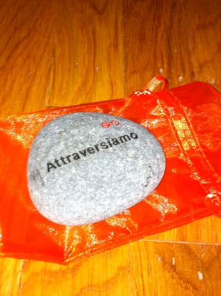 Just as we were walking through the town searching for the right eating spot, I gasped out loud,"Oh dear, I forgot to take a photograph of the huge, white Buddha at the entrance to the store!" Life partner comforted me at once, "After lunch we'll go back on our way and I'll take a picture of you standing by the Buddha." "No need for tourist pictures," I replied with a laugh, "It was bad enough that I bought a river stone with Attraversiamo inscribed on it! How embarrassing is that! Don't tell anyone I did that, for goodness sake. Have I become an Eat, Pray, Love groupie?"